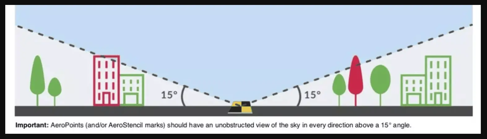 When planning AeroPoint placement, look for possible line-of-sight obstructions. Avoid placing them under trees, near fences, or any other obstacles. Doing so could interfere with their communication with GPS satellites. AeroPoints should have an unrestricted view of the sky in every direction above a 15 degree angle.