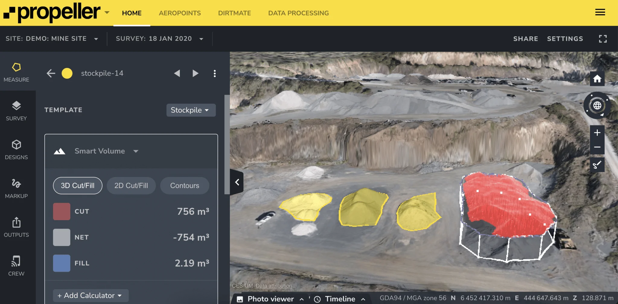 After flying a drone over their sites, surveyors can use a photogrammetry software platform like Propeller to process their data and calculate cut and fill volumes for the current terrain against previous levels and also the project’s design surfaces. Once the measurements are complete, the information can be shared across the team and other relevant stakeholders. Data is downloadable in industry-standard file formats (including CSV, JPEG, GeoTIFF, DXF, and other files types) and in a wide range of coordinate reference systems.