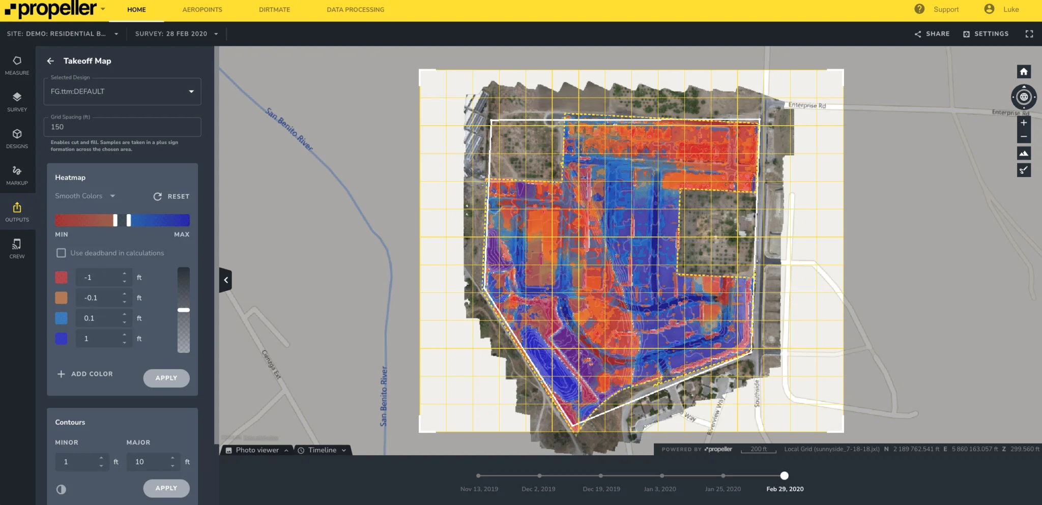 Contractors can generate customized surveys from their drone data processed with a software solution like Propeller. Using a tool such as a contours/heat map function, they can specify major and minor intervals on their job site, and a range of data sharing options allows effective collaboration among project teams and other stakeholders. Contour maps can be viewed within the software platform or be exported as PDF files or (for standard contours) as DXF files.