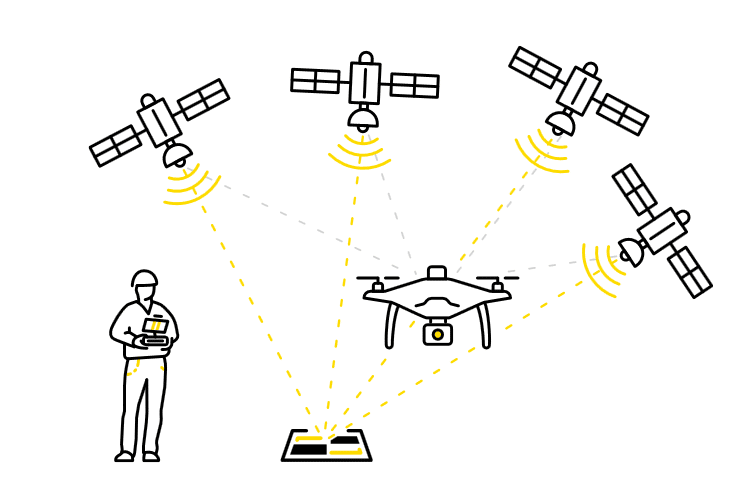 A passive base station on the ground sends raw GPS data to the drone. Then the drone’s on-board GPS combines that info and its own observations to accurately determine its position relative to the base.