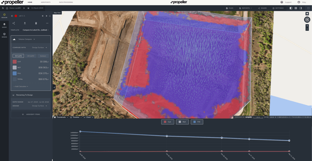 Using Propeller, you can generate more intuitive cut/fill maps that represent overfill and airspace, using higher resolution data with just a few clicks (see example below).