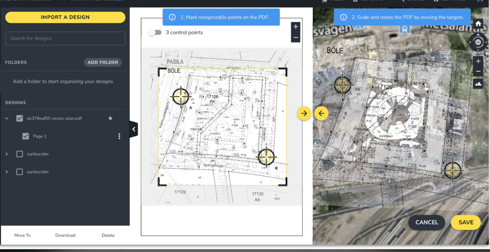 - Easily add up to three geo-reference points to ensure drone surveys and PDF designs are aligned
