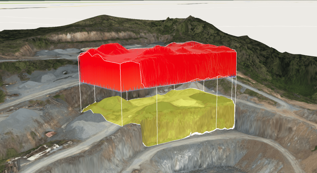 Overall pit volume compared against previous flight data. Areas in red show extracted material