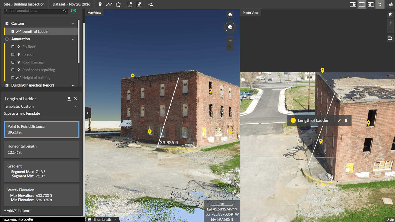Any blast area can be easily and inexpensively surveyed with a drone. The Propeller Platform processes the raw data, and presents it as accurate 3D models, orthophotos, and digital point clouds, allowing for easy drill depth calculations and further analysis.