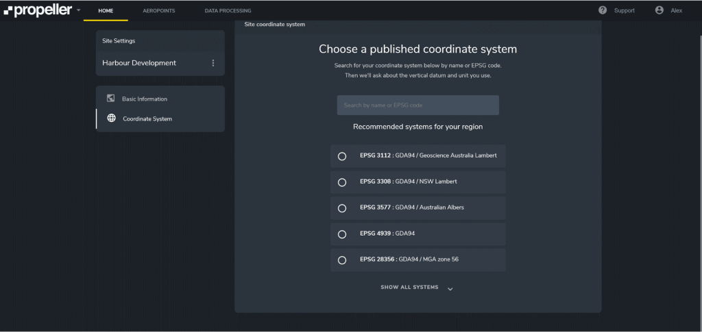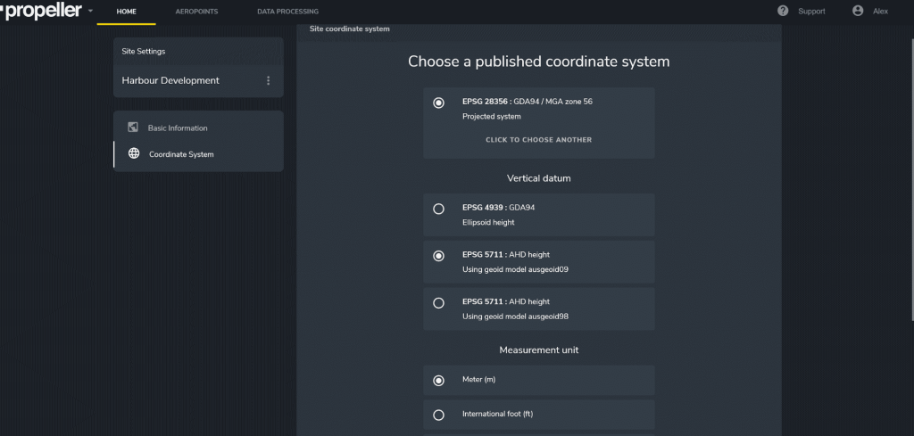 In Propeller’s online viewer: You can also change the CRS (or projection), reference ellipsoid or geoid, and output units (metric or US imperial) in the Coordinate System tab in your Site Settings. This can be useful if you want to observe a particular location on your site where you know the latitude and longitude, or if you’ve got data you want to cross-reference in another CRS.