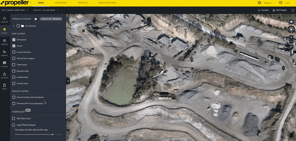 Earthworks sites around the world constantly have to prepare and plan for significant weather events that could impact their workflow and project progress, including flowing and standing water due to heavy rainfall. Now, you can measure and analyze the potential impact of these sometimes unforeseen events across your worksite by using Propeller’s new Hydrology platform feature. Here, we explain how the feature works.