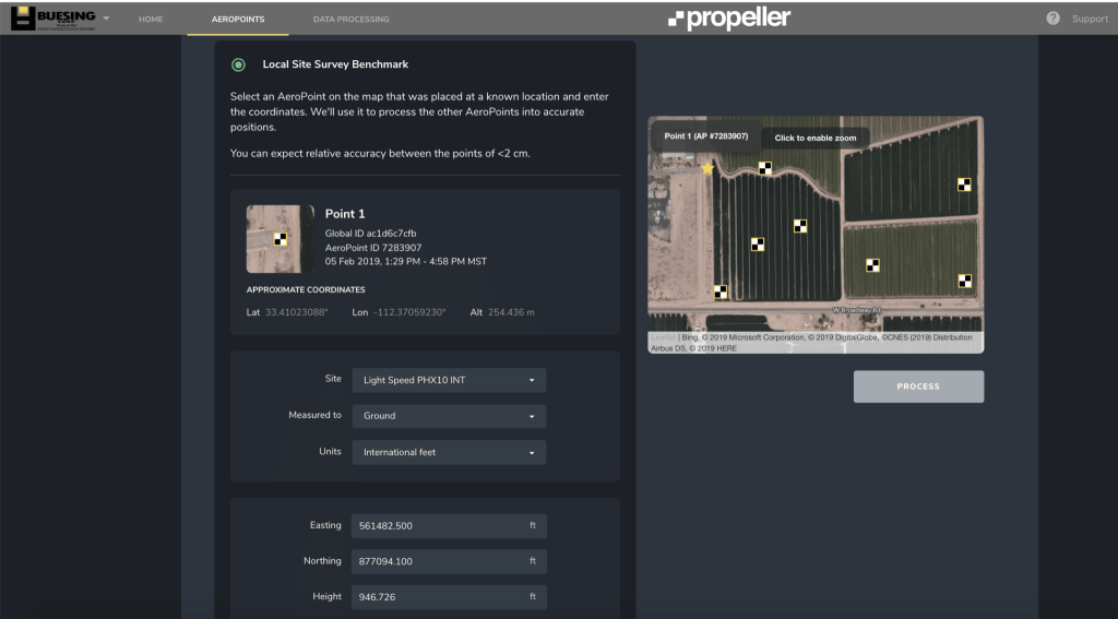 Please note that Local Coordinate Systems and Local Site Survey Benchmark processing options are only supported when processing data sets using AeroPoints with the Propeller or Stratus platforms. If you would like more information, please contact us.