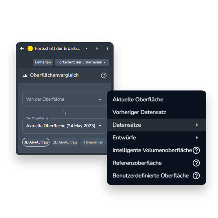 Berechnen Sie das Volumen im Vergleich zu früheren Datensätzen oder importierten Sie Entwurfsoberflächen. So können Sie das abgetragene oder aufgeschüttete Volumen sehen.