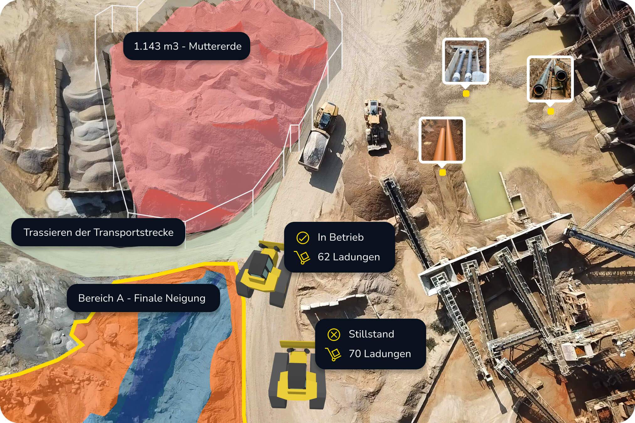 - Drohnenvermessungen: Regelmäßige Drohnenflüge liefern Ihnen eine genaue topografische Karte mit realistischen Bildern. Ihr Team kann diese Daten für Volumenberechnungen, Querschnittsmessungen und Fortschrittsdokumentationen im Zeitverlauf nutzen.