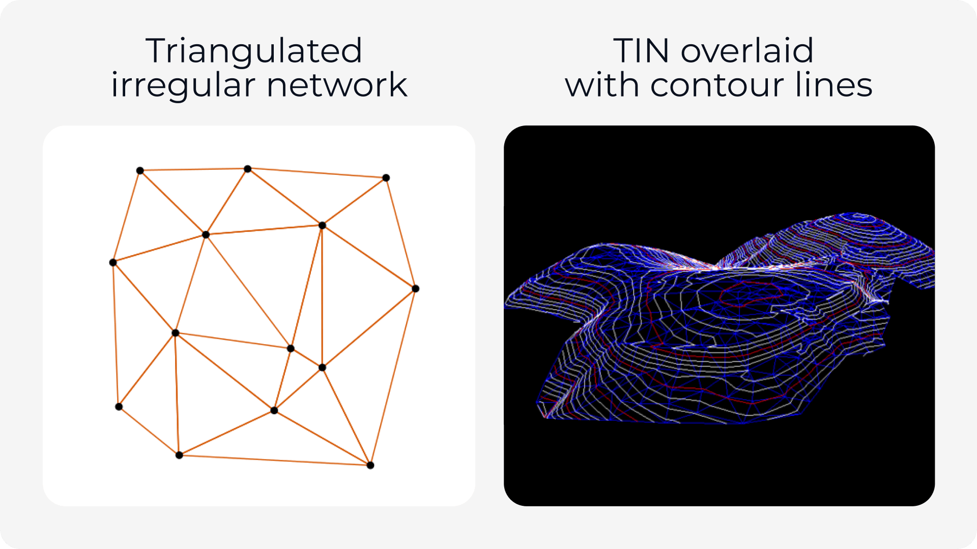 Eine TIN-Oberfläche (Triangular Irregular Network) ist eine 3D-Darstellung eines Geländes, die aus einer Reihe miteinander verbundener Punktdreiecke (x-, y- und z-Koordinaten) besteht. Anwendung finden TIN-Oberflächen vor allem im Hoch-, Tief- und Erdbau zur Geländemodellierung, zum Messen von Volumina und zur Überprüfung von Entwürfen anhand von Bestandsplänen.