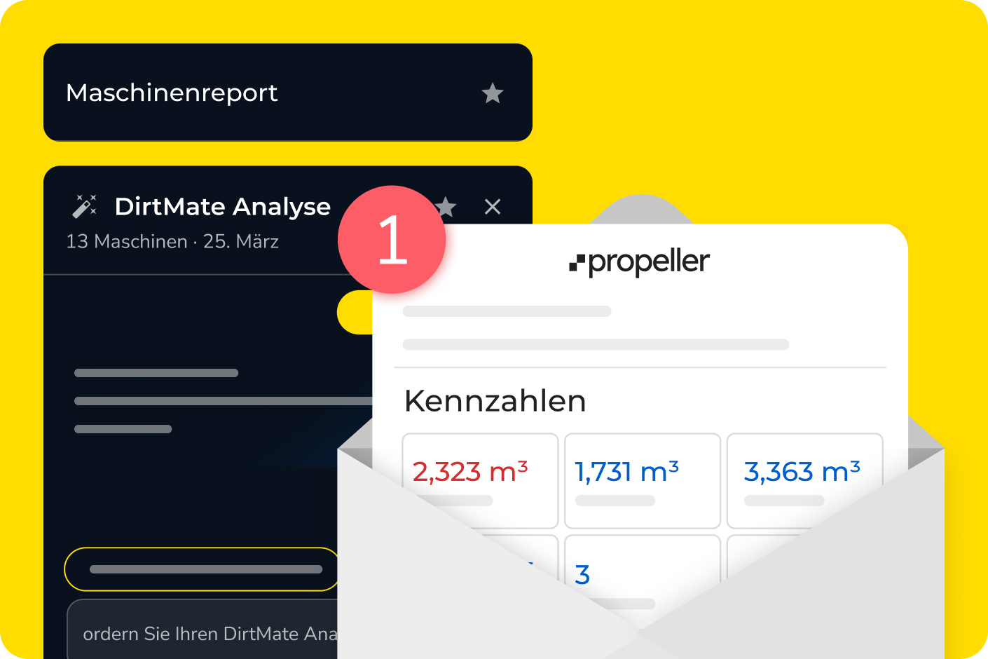 DirtMate Cab ist eine neue Funktion der Propeller Mobile App, die Sie direkt in der Fahrerkabine bedienen können. So erhalten Baumaschinenführer Daten zu Produktion und Abtrags- und Auftragsvolumen in Echtzeit – ohne zusätzliche Hardware.