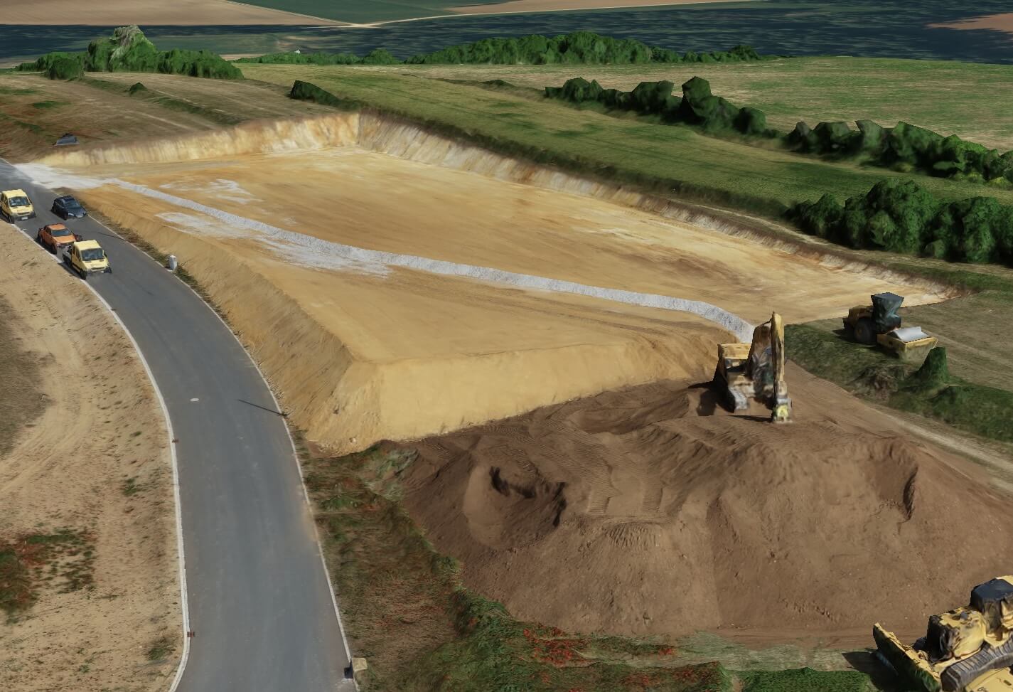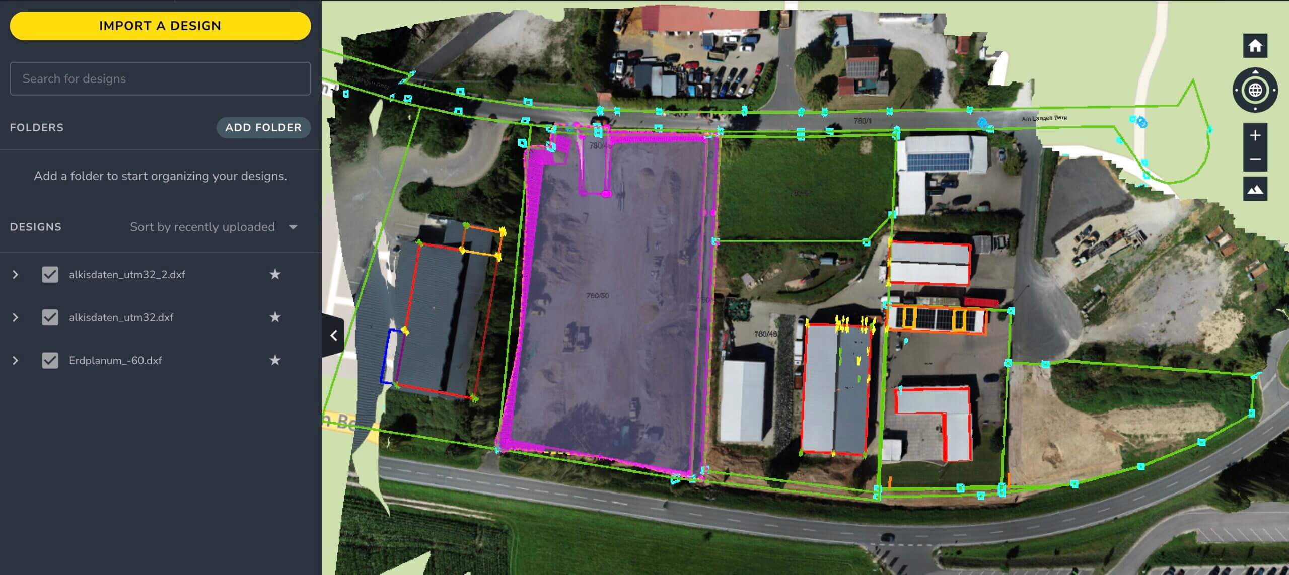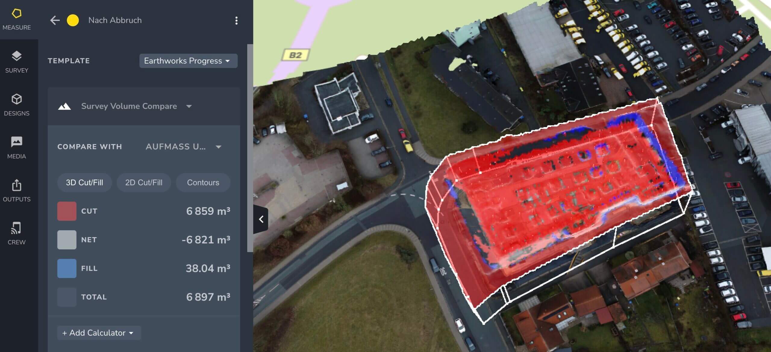 Die gleiche Funktion verwendet Herr Kornburger auch für die Erstellung von Massenberechnungen. Er befliegt dazu das Urgelände und legt die Entwurfspläne über das Orthophoto. So kann er erkennen, wie viel Materialüberschuss oder -unterschuss vorhanden ist und darauf basierend ein genaues Angebot erstellen.